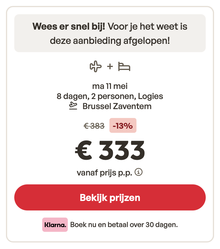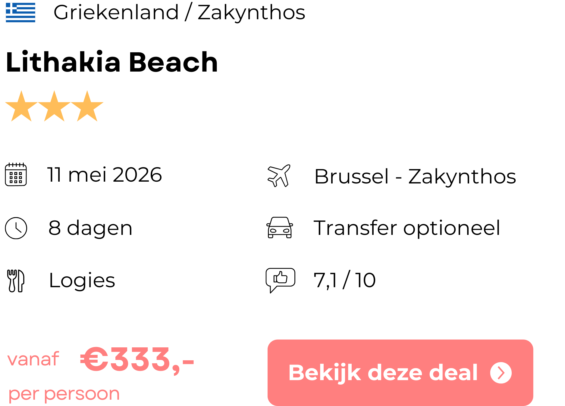 Hieronder vind je het boekingsvoorbeeld van deze aanbieding naar Zakynthos. Wil je meer weten over deze aanbieding of ben je benieuwd naar de foto’s van de accommodatie? Klik dan op het boekingsvoorbeeld of op de knop hieronder om naar de website van de aanbieder te gaan.