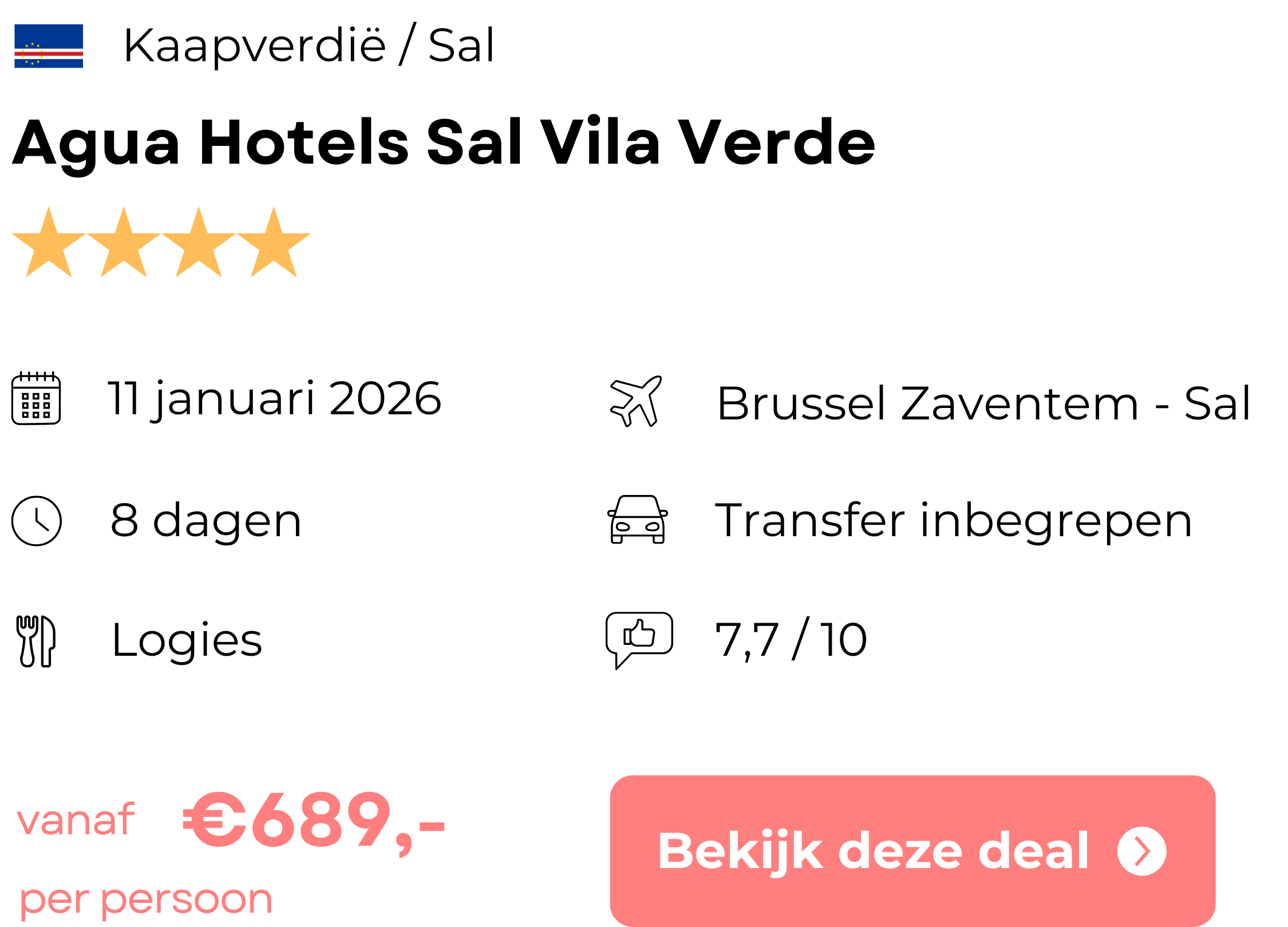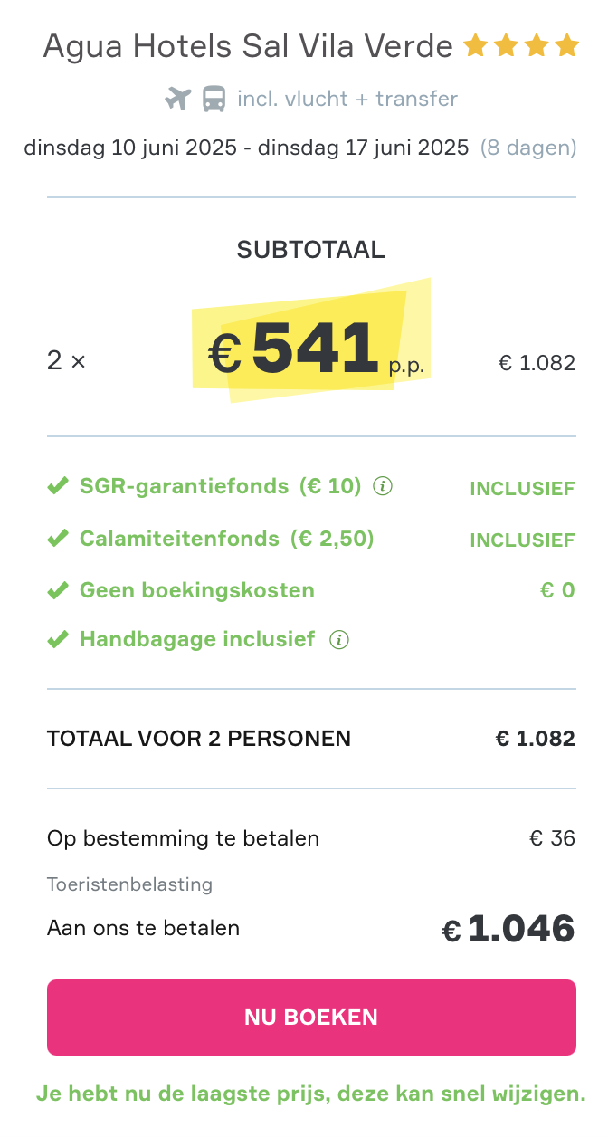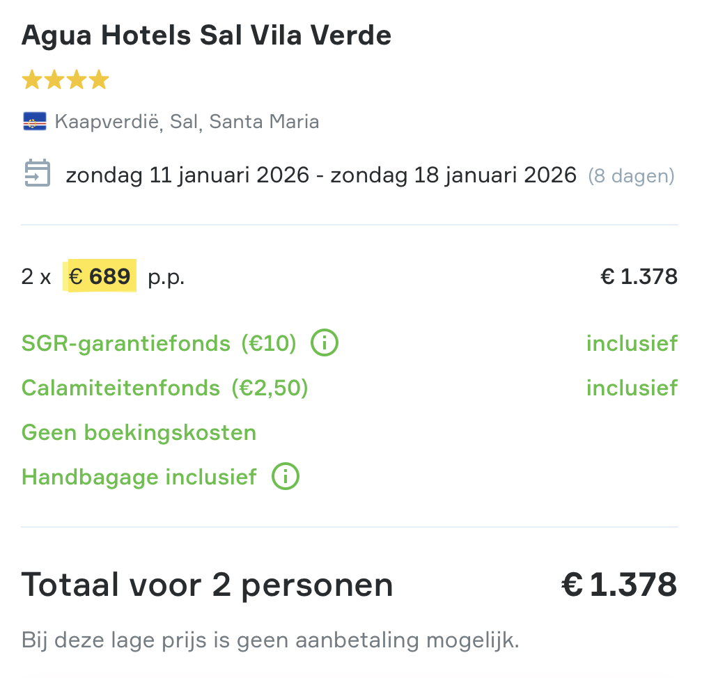 Hieronder vind je het boekingsvoorbeeld van deze aanbieding naar Kaapverdië. Wil je meer weten over deze aanbieding of ben je benieuwd naar de foto’s van de accommodatie? Klik dan op het boekingsvoorbeeld of op de knop hieronder om naar de website van de aanbieder te gaan.