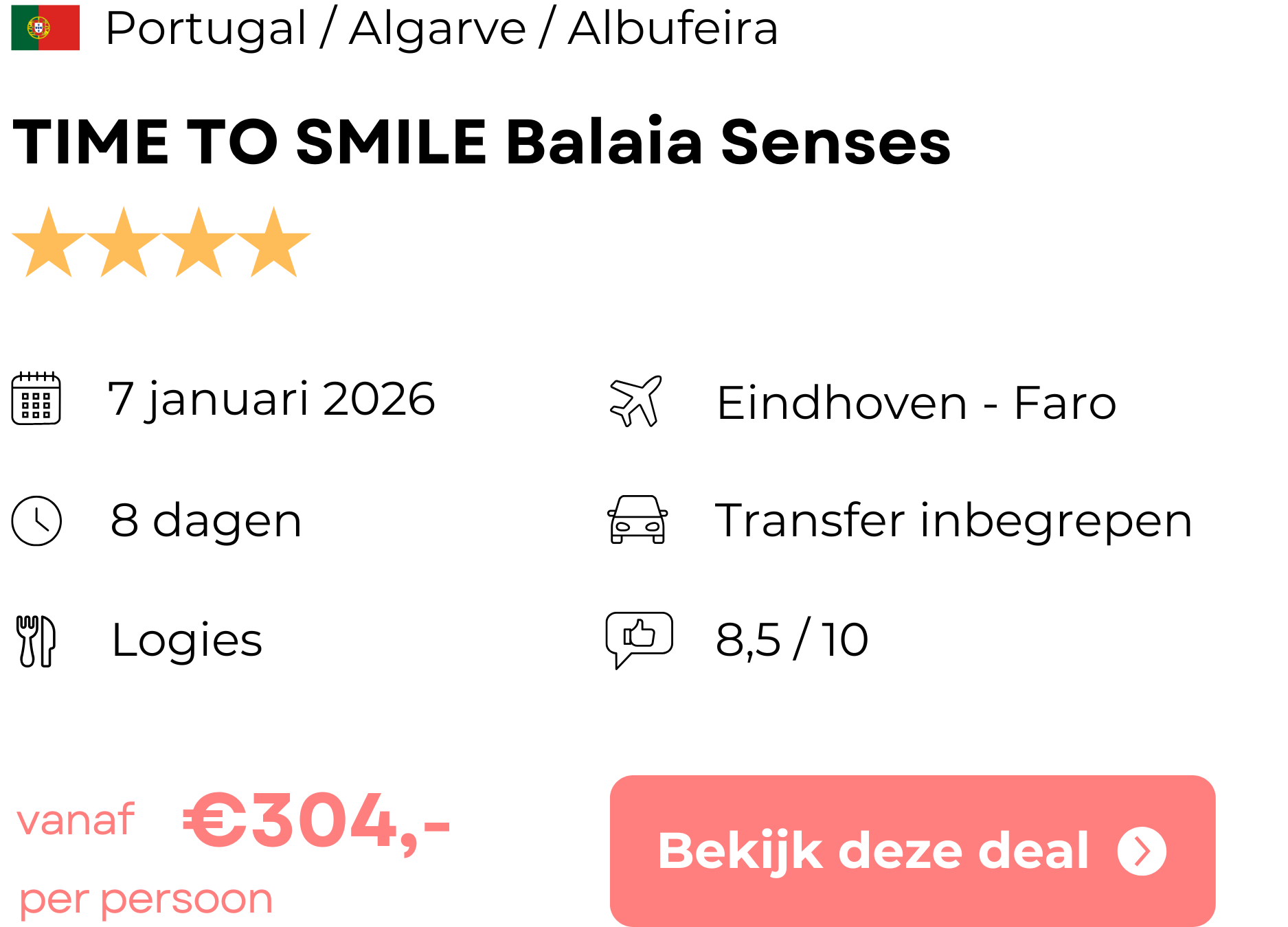 Hieronder vind je het boekingsvoorbeeld van deze vakantie naar de Algarve. Wil je meer weten over deze aanbieding of ben je benieuwd naar de foto’s van de accommodatie? Klik dan op het boekingsvoorbeeld of op de knop hieronder om naar de website van de aanbieder te gaan.