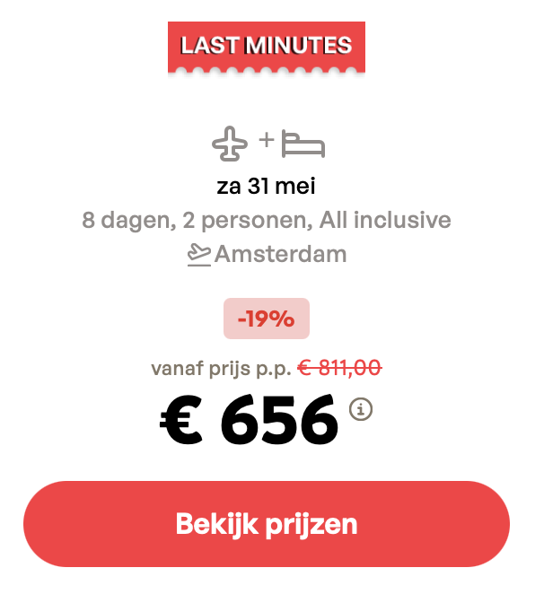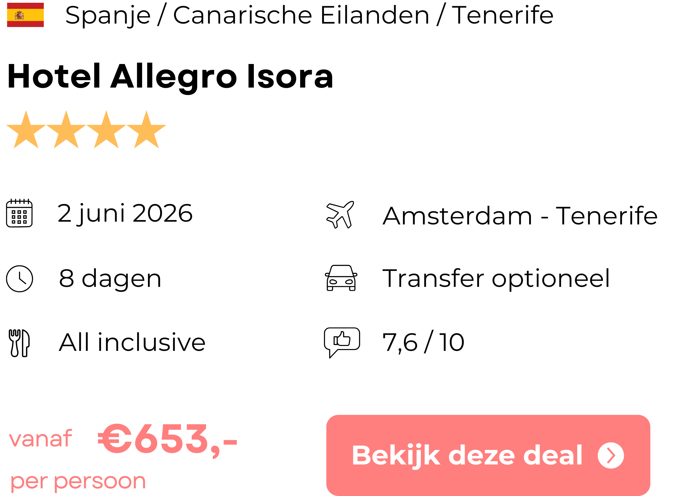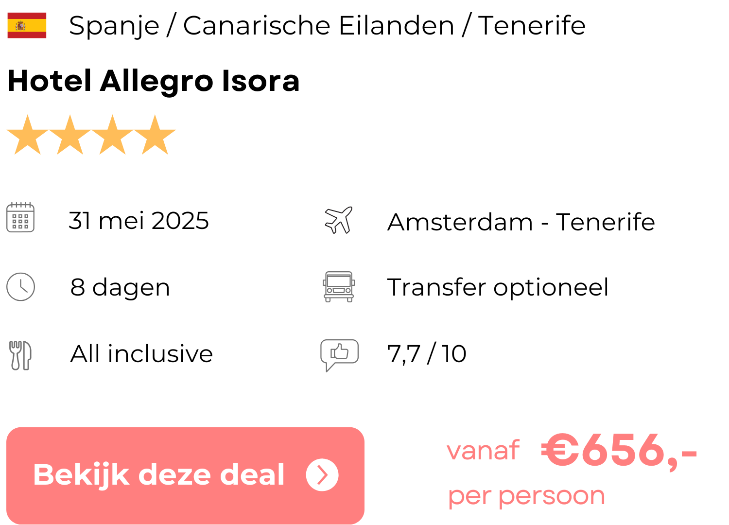 Hieronder vind je het boekingsvoorbeeld van deze vakantie naar Tenerife. Wil je meer weten over deze aanbieding of ben je benieuwd naar de foto’s van de accommodatie? Klik dan op het boekingsvoorbeeld of op de knop hieronder om naar de website van de aanbieder te gaan.